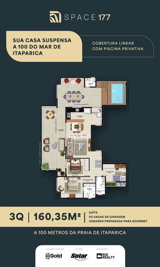Apartamentos de 3 quartos com opções de até 2 suítes com até 2 vagas de garagem, plantas de 89m² a 105m², 2 coberturas lineares de 168m² a 205m² e 3 vagas de garagem.